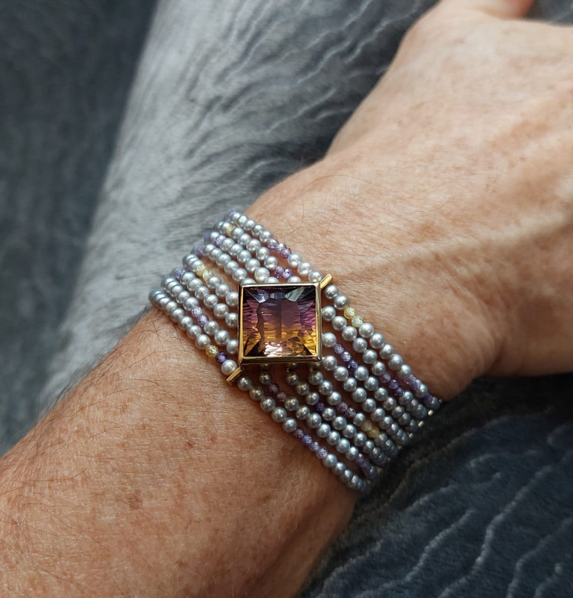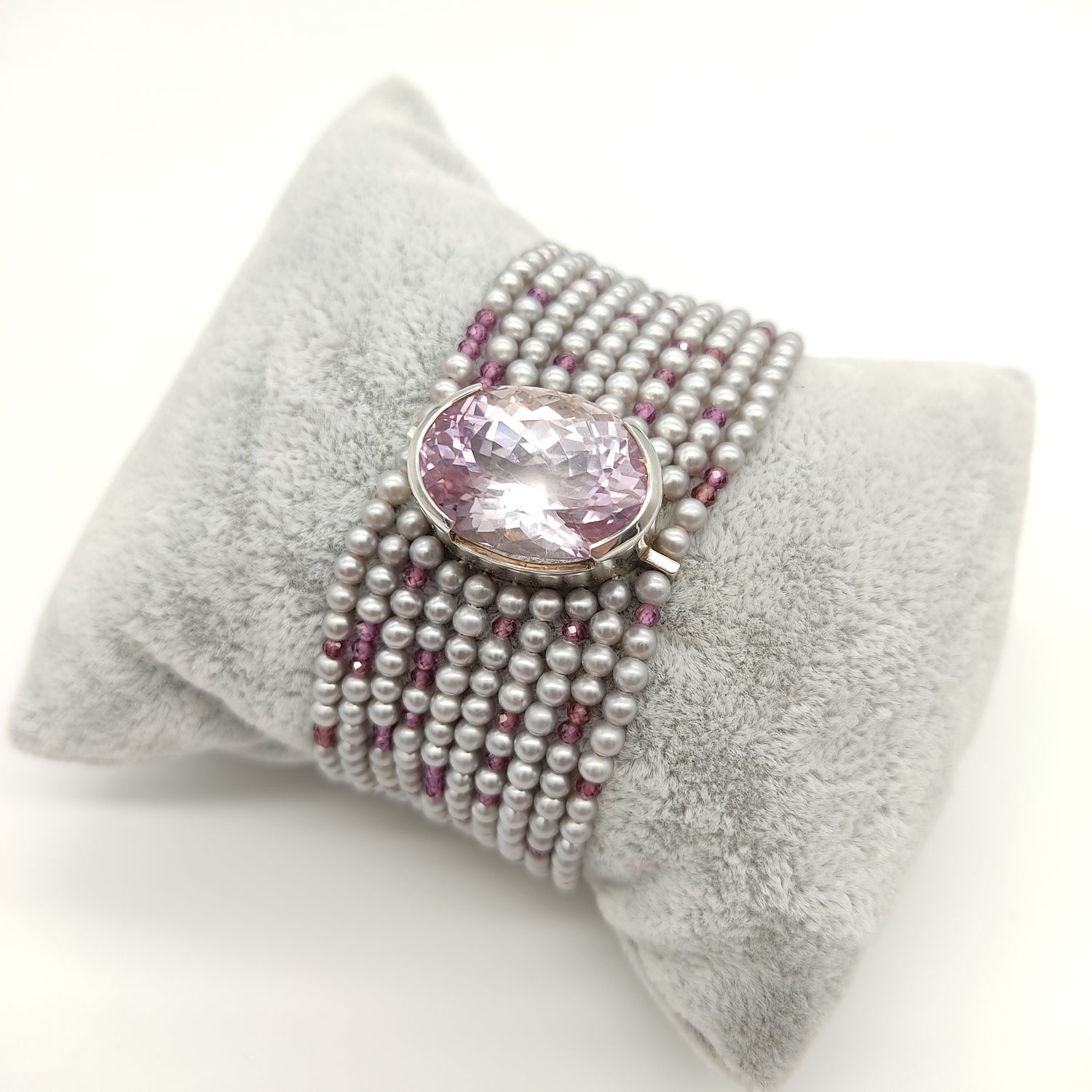 Manchette en perles d'eau douce et perles de grenat rhodolite. Pierre centrale : kunzite montée sur argent.