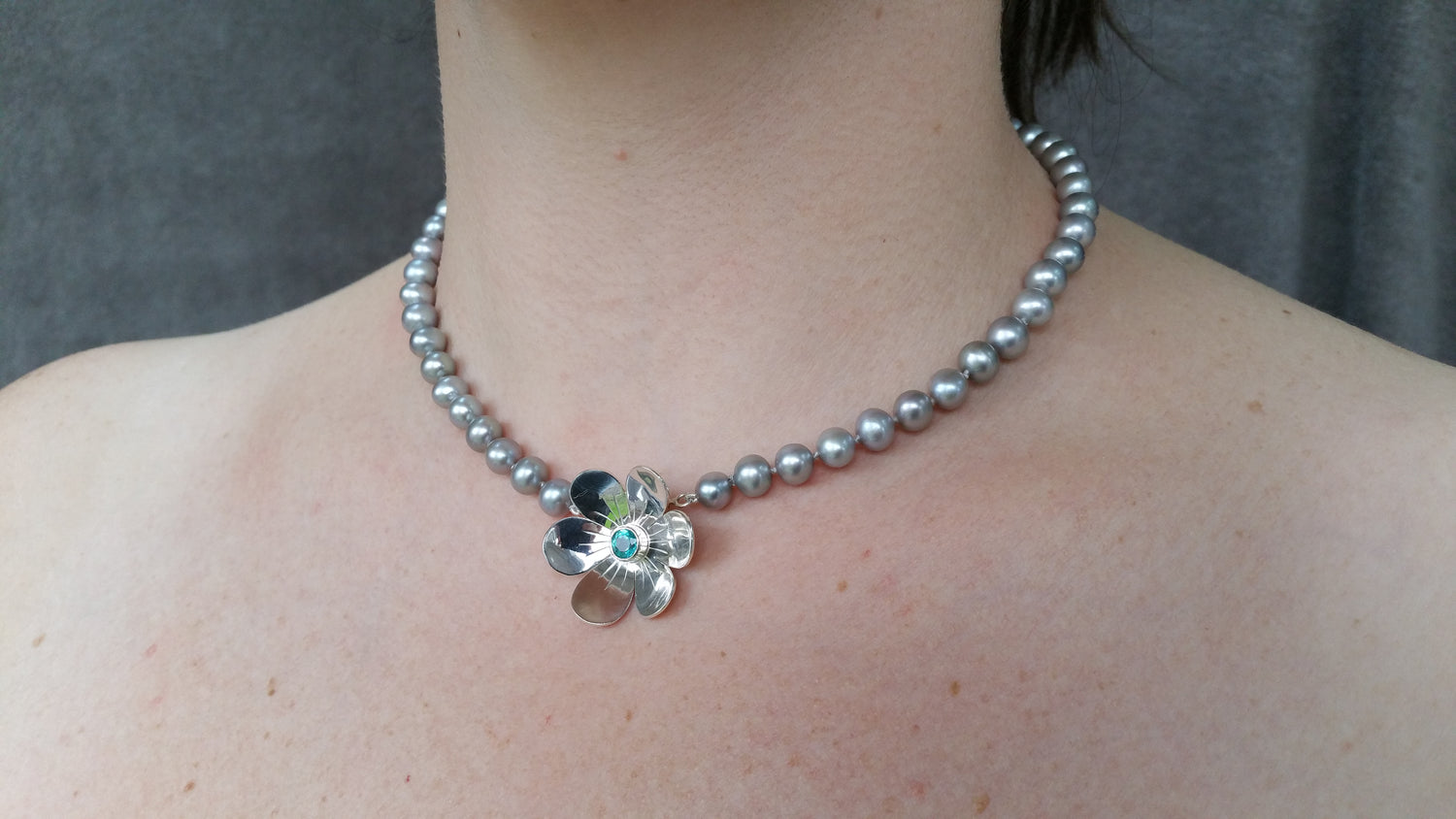 Collier chocker (45 cm) agrémenté d'une fleur en argent 925/1000 avec en son centre une apatite.