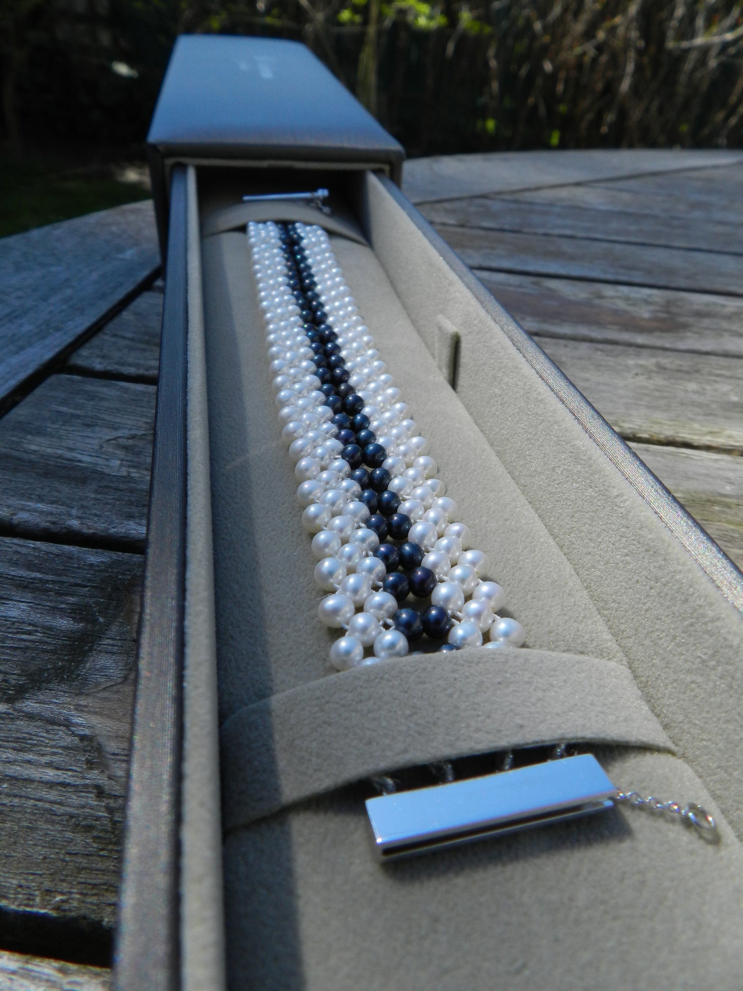 Bracelet de perles d'eau douce noires et blanches en résille double montées sur fil de soie, fermoir or blanc.