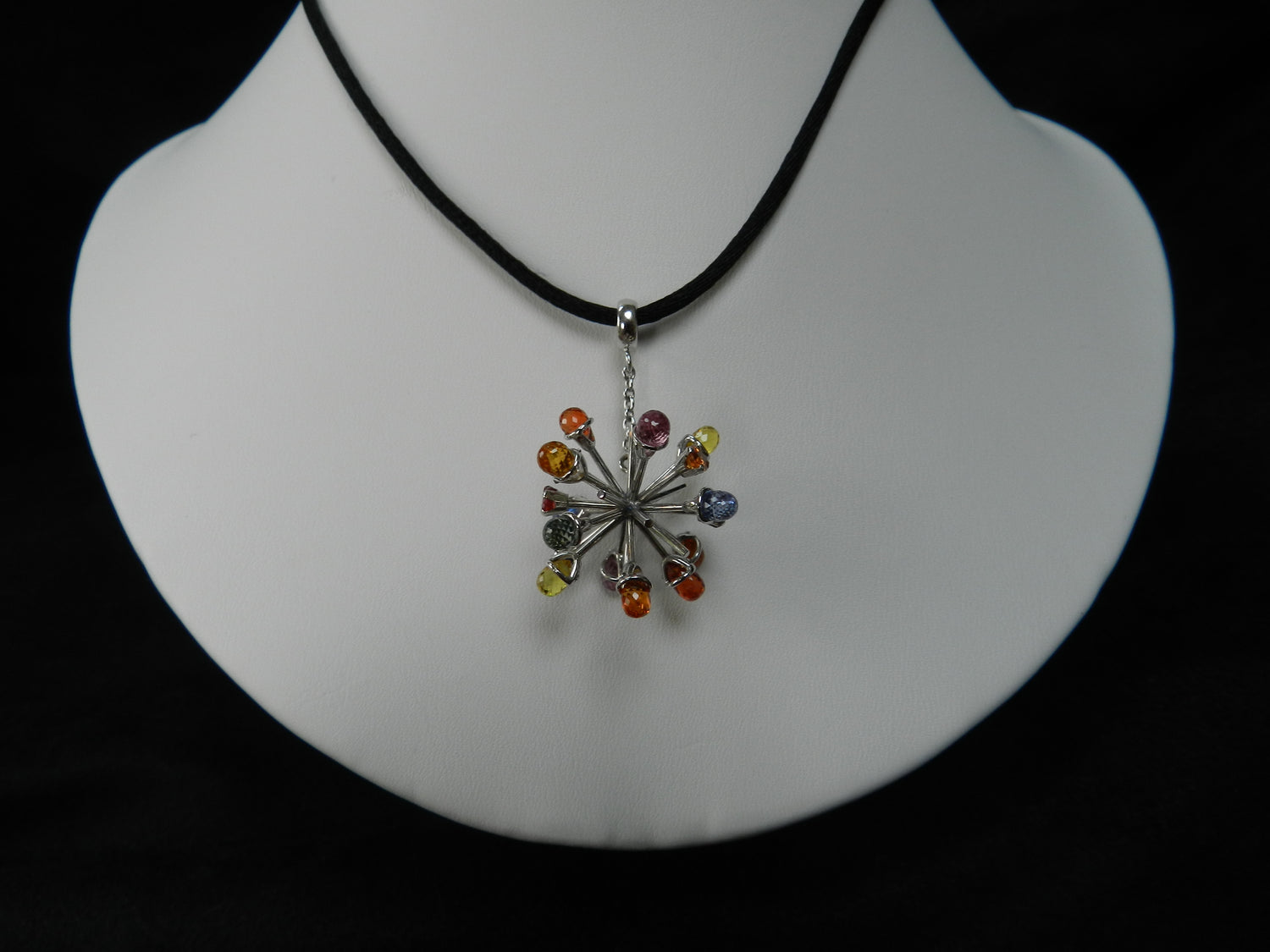 Pendentif esprit "fleur de pissenlit" en or blanc et saphirs multicolores tailles briolettes et tailles brillants.