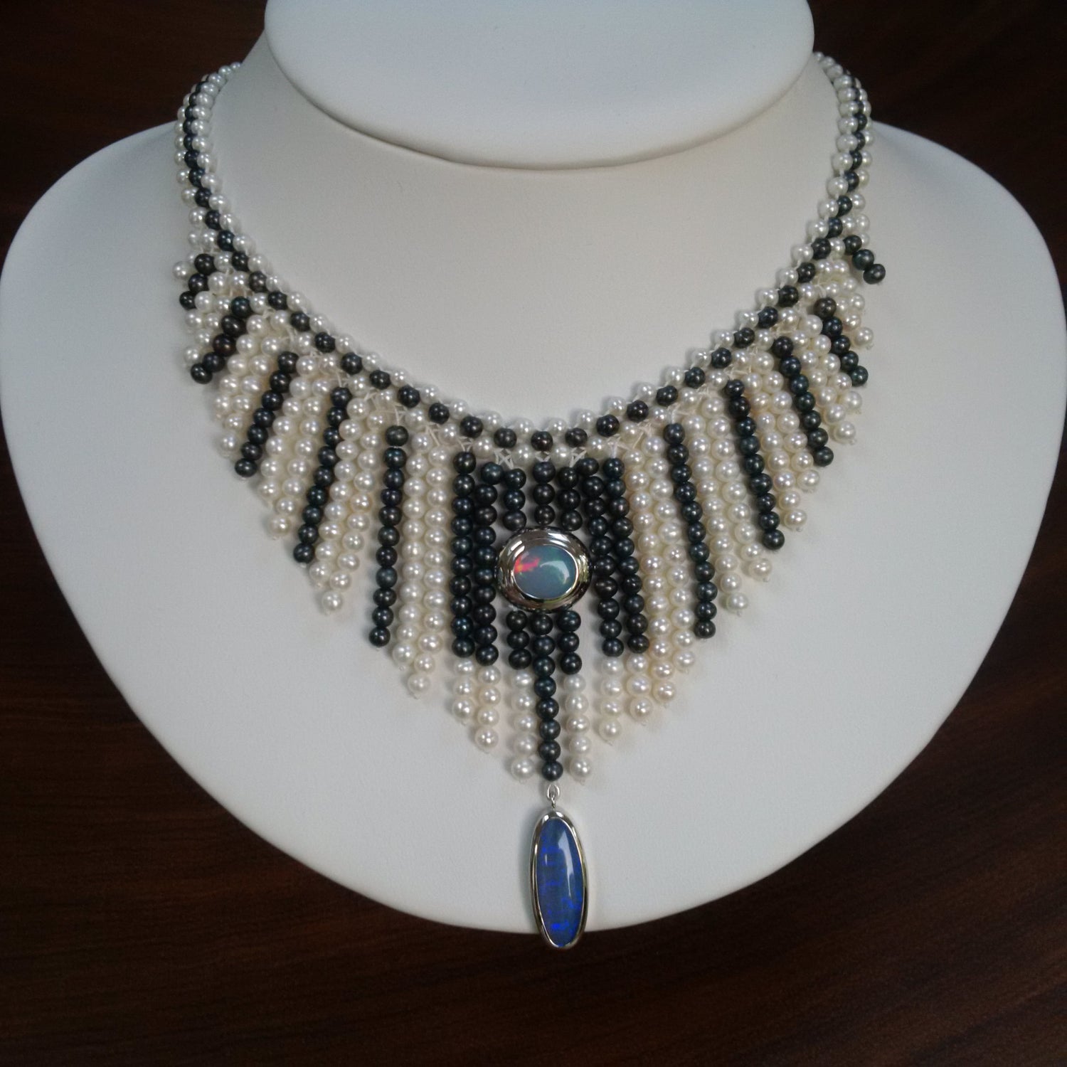 Cette rivière de perles naturelles blanches et noires est réhaussée par deux magnifiques opales.