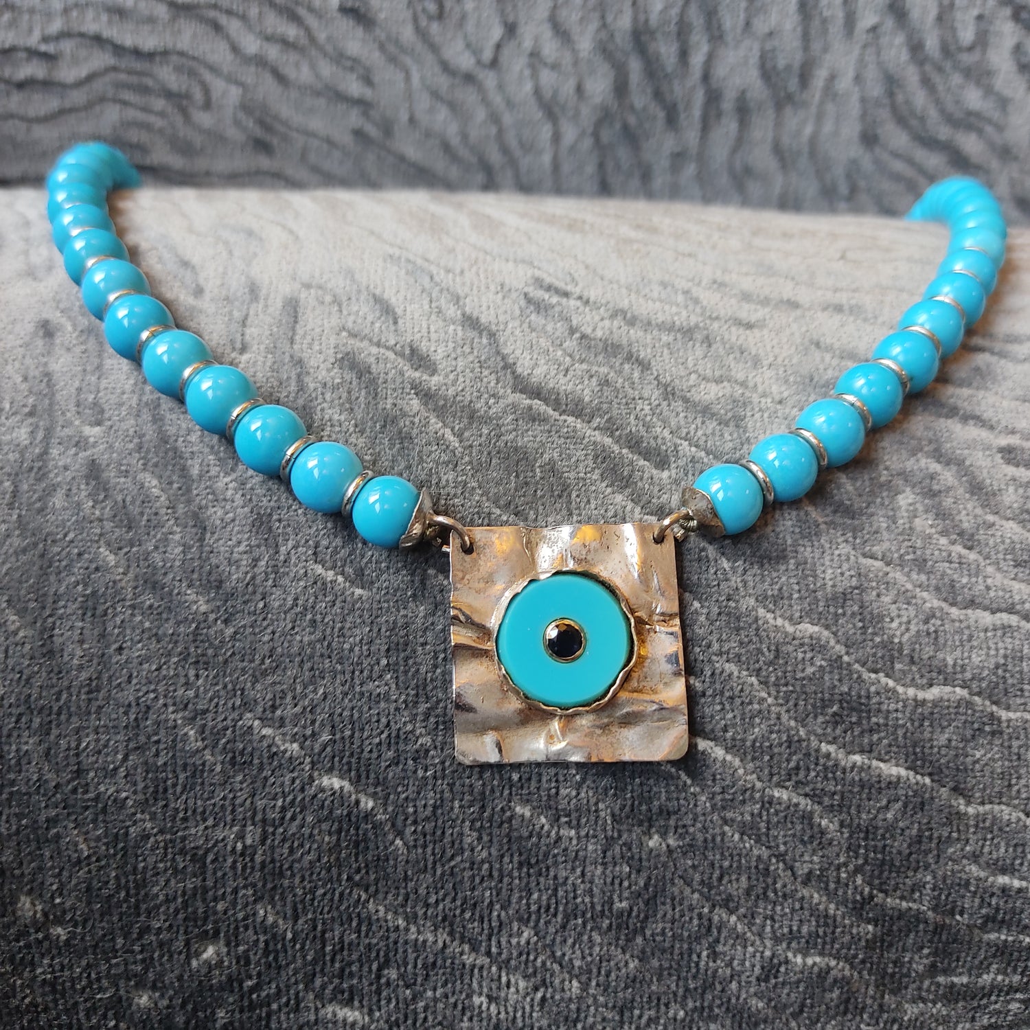 Perles de turquoise et disque de turquoise central serti d'un saphir, or blanc froissé.