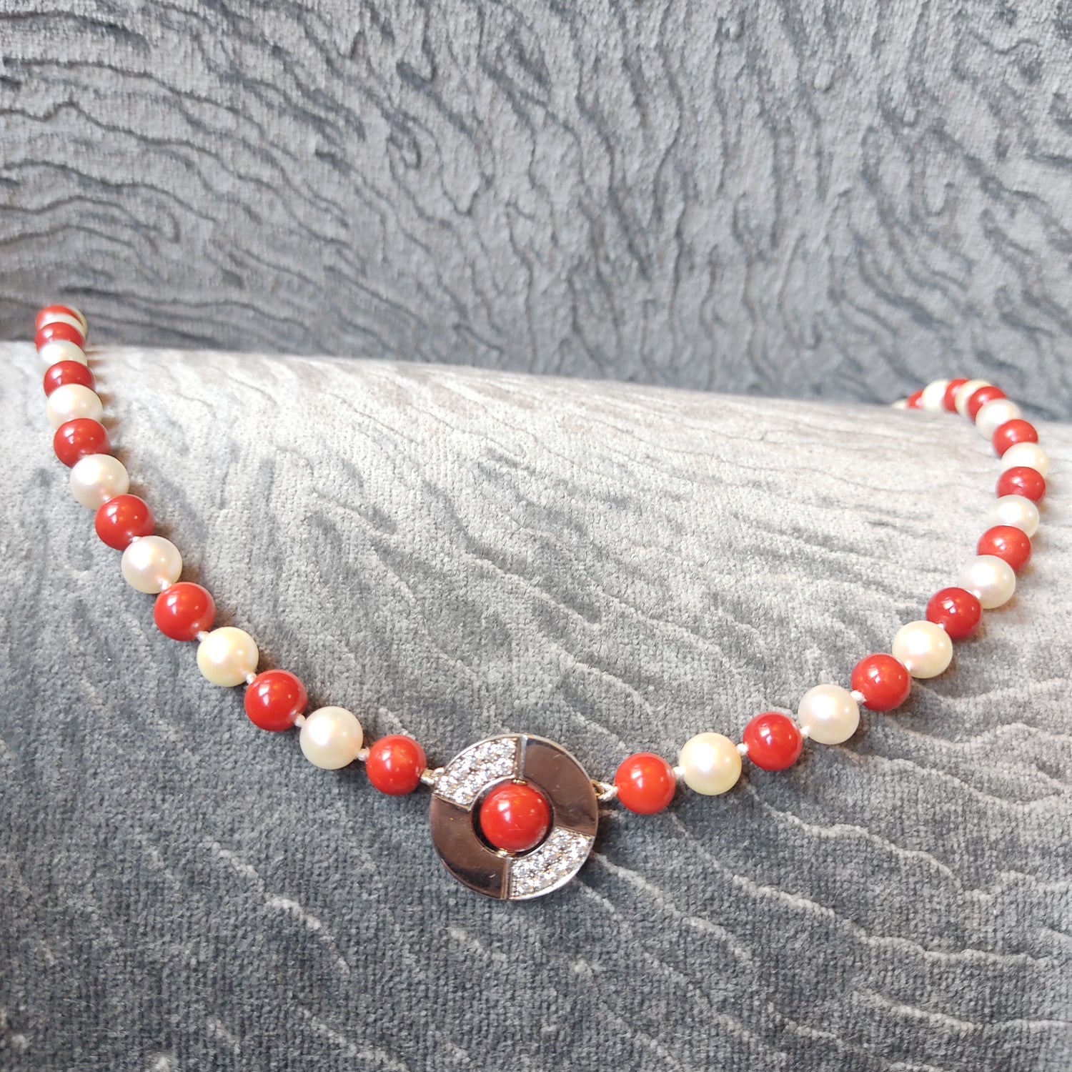 Magnifique collier de perles d'eau douce et perles de corail rouge. Perle centrale montée sur or blanc serti de diamants.