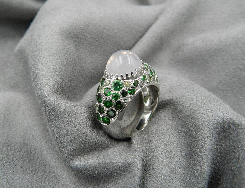 Bague cabochon en quartz rose et pavage de Tsavorites et saphirs verts, monté sur or blanc.